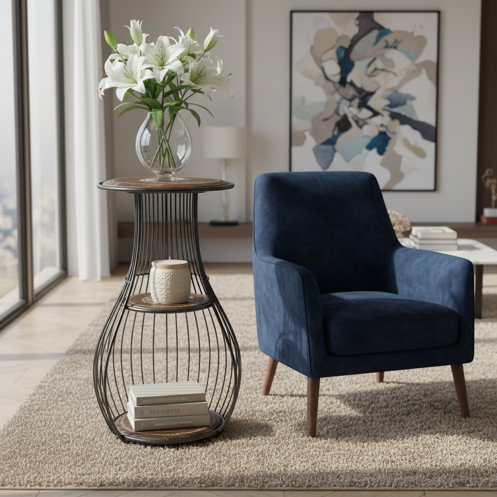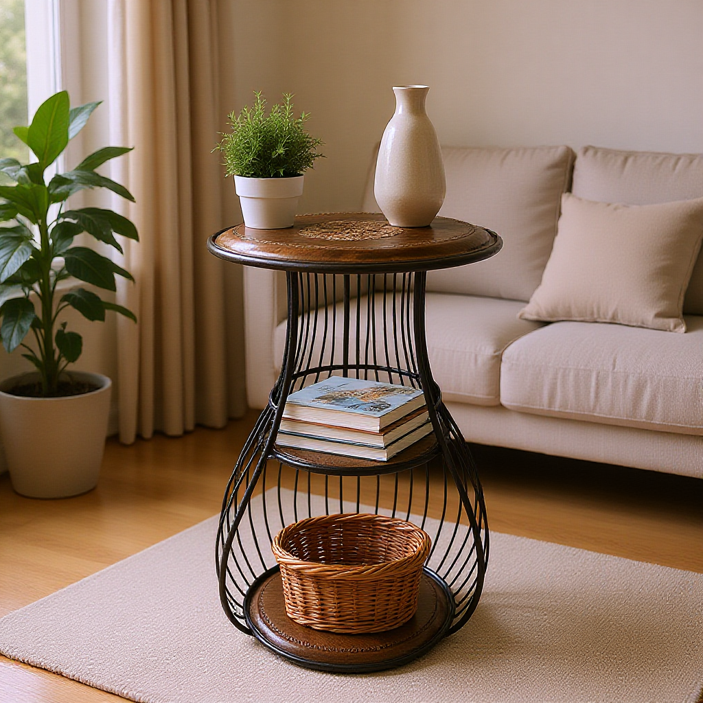 Doğal ahşabın sıcaklığı ile ferforjenin zarif duruşu bir araya geliyor.Üç katlı yapısı sayesinde hem dekoratif objelerinizi sergilemek hem de küçük bitkiler,mumlar,minik aksesuarlar için fonksiyonel bir alan oluşturur.