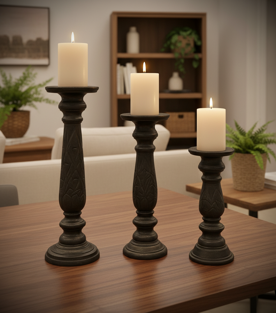Farklı yüksekliklerdeki bu 3 lü mumluk seti masanızda,konsolunuzda veya şömine üzerinde ,dinlenme köşenizde kusursuz bir denge oluşturur.