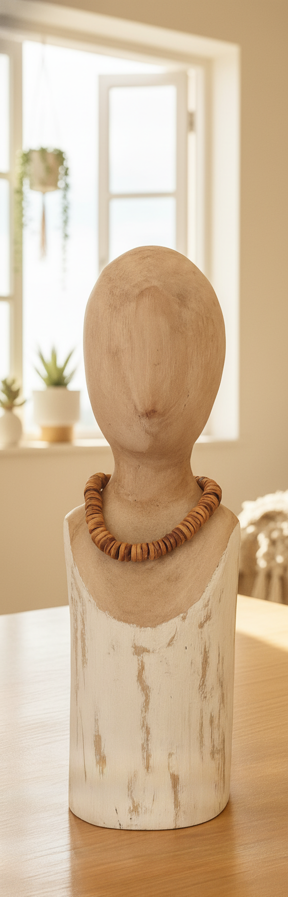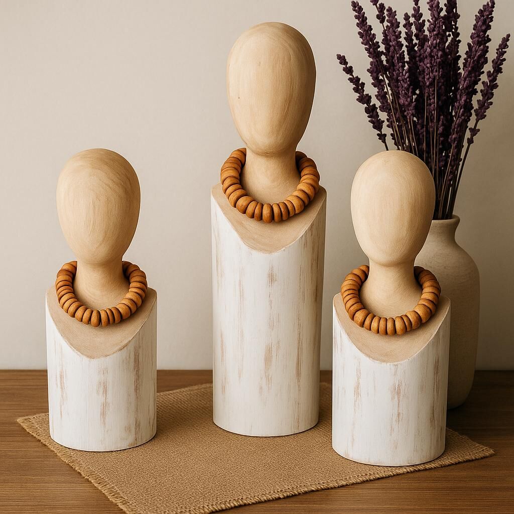 Tamamen ahşaptan üretilen bu el işçiliği büst,eskitme beyaz detayları ve sade formu ile her ortamda dikkat çeker.