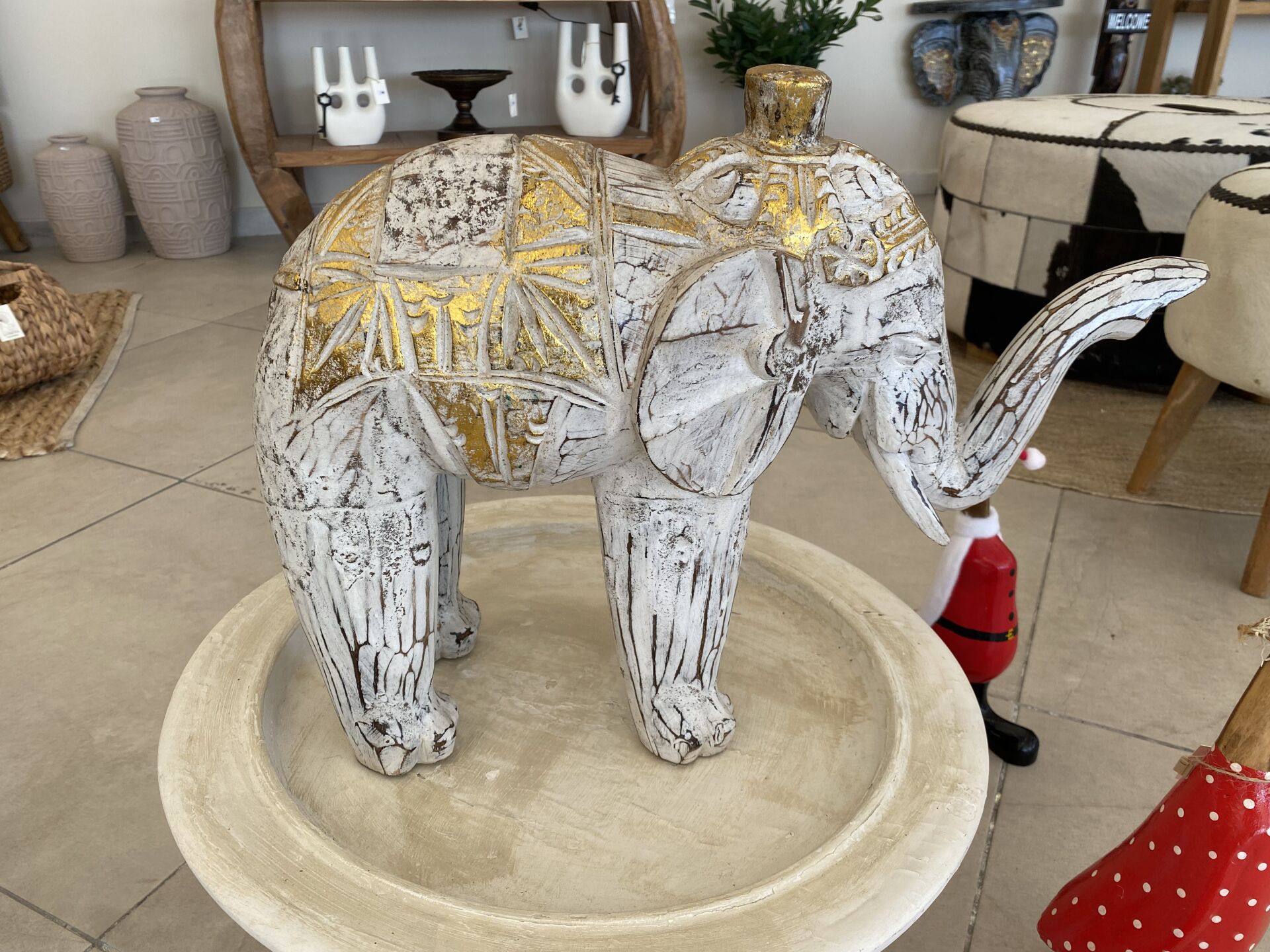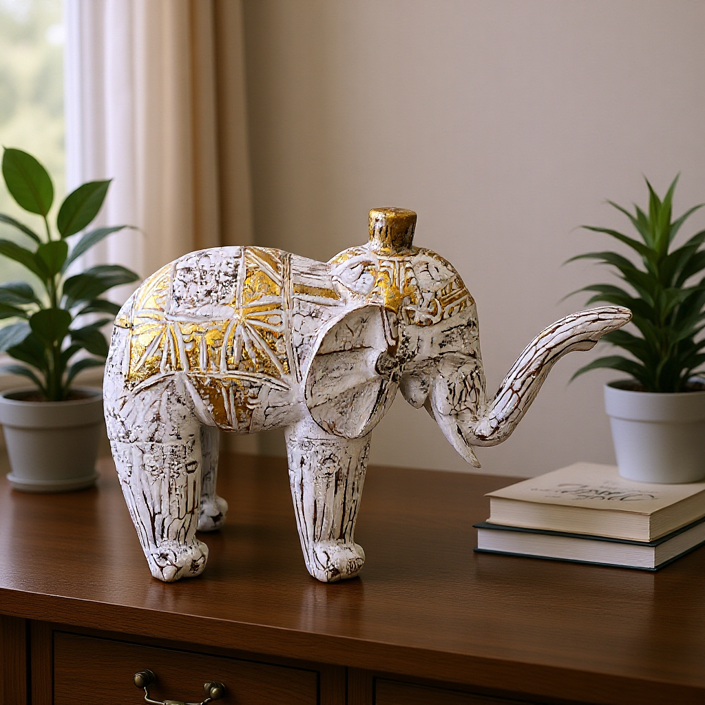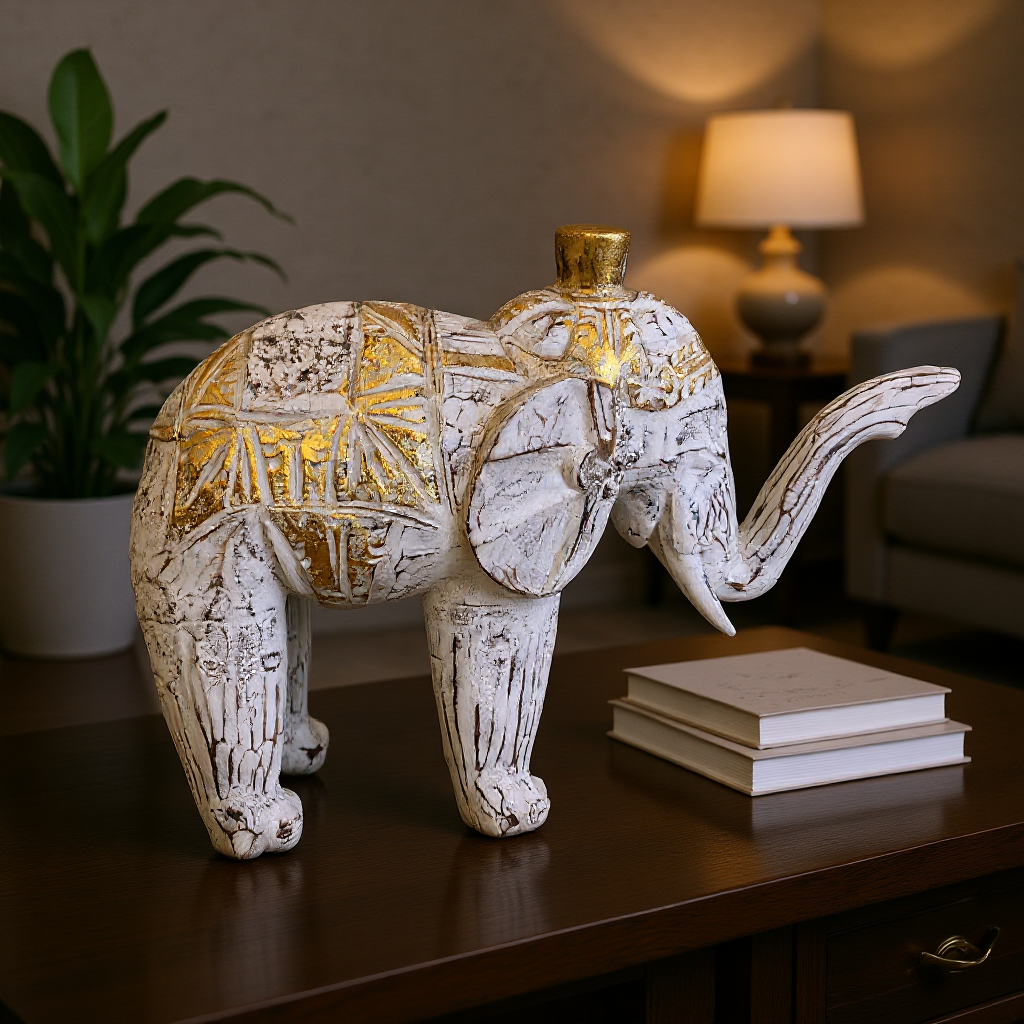Bilgeliğin,sarsılmaz gücün ve bereketin simgesi olan bu özel fil heykeli;beyazın asaletiyle altın varak detayların ihtişamını tek bedende buluşturuyor.El işçiliğini hissetttiren dokusu,etnik motiflerle zenginleştirilmiş yüzeyiyle mekanınıza yalnızca estetik değil,pozitif bir enerji taşır.