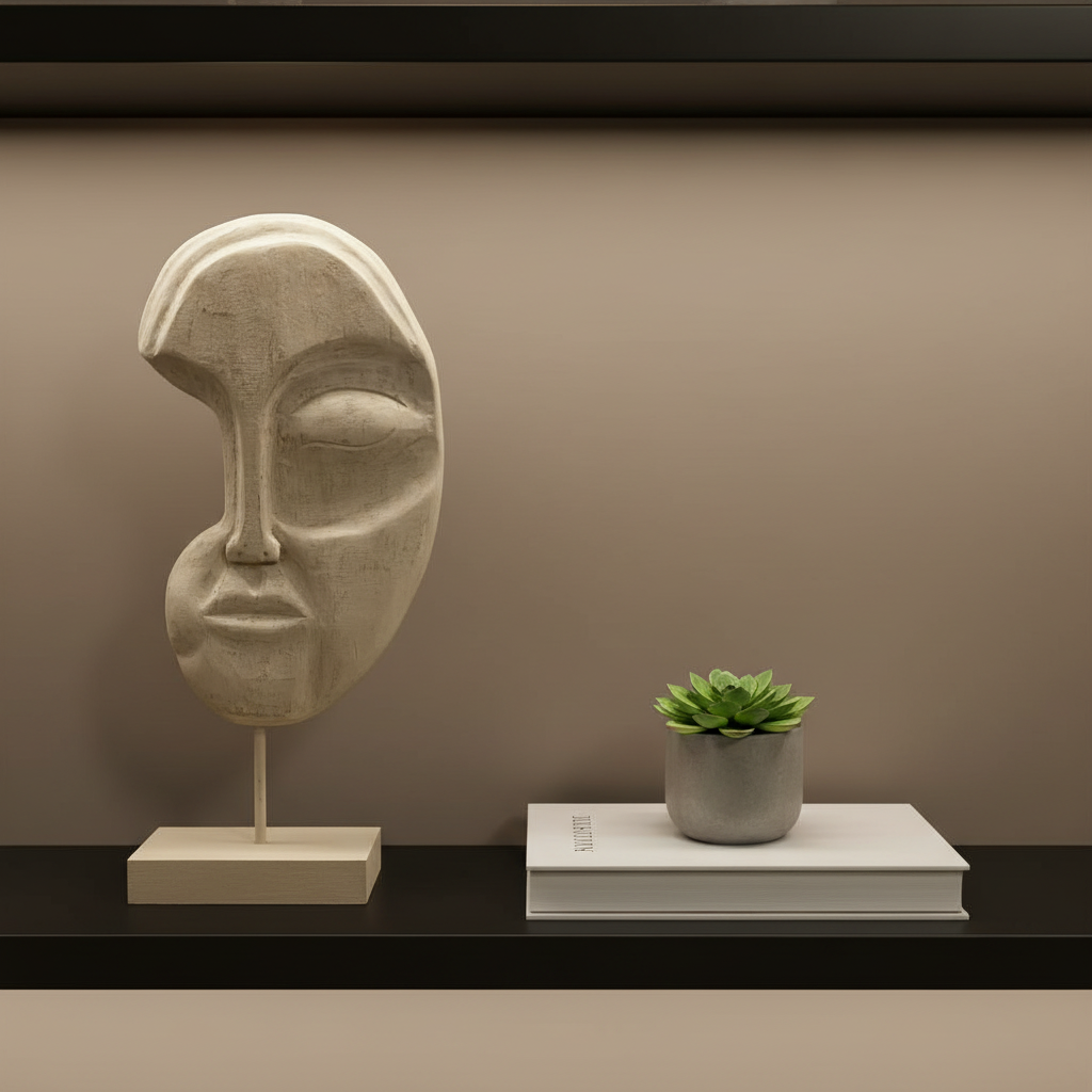 Doğal ahşabın sıcaklığıyla şekillenen bu yüz silüeti ,sade çizgilere gizlenmiş güçlü bir ifadeyi taşıyor.Yontulmuş yüzeyindeki her iz,el işçiliğinin ruhunu yansıtırken,heykelin minimal formu modern dekorasyonlarla mükemmel uyum sağlar.