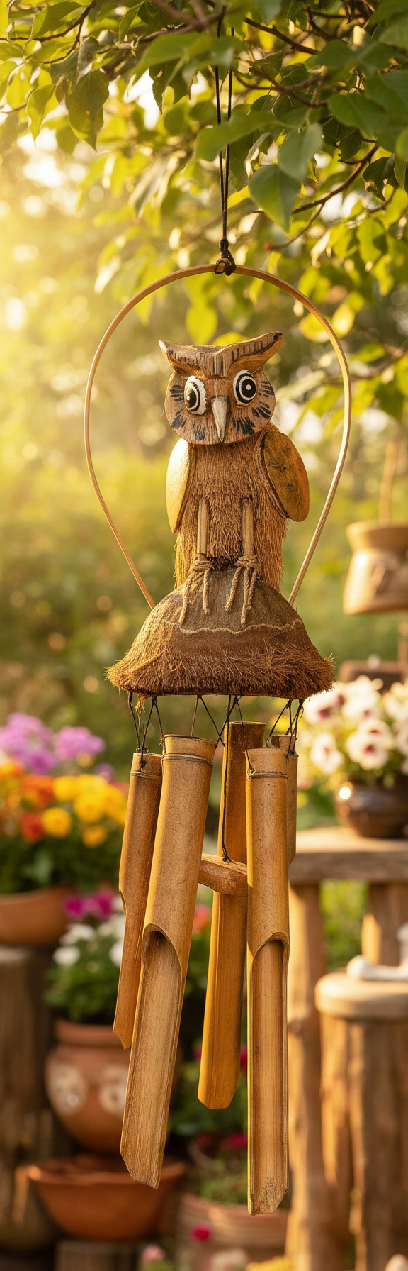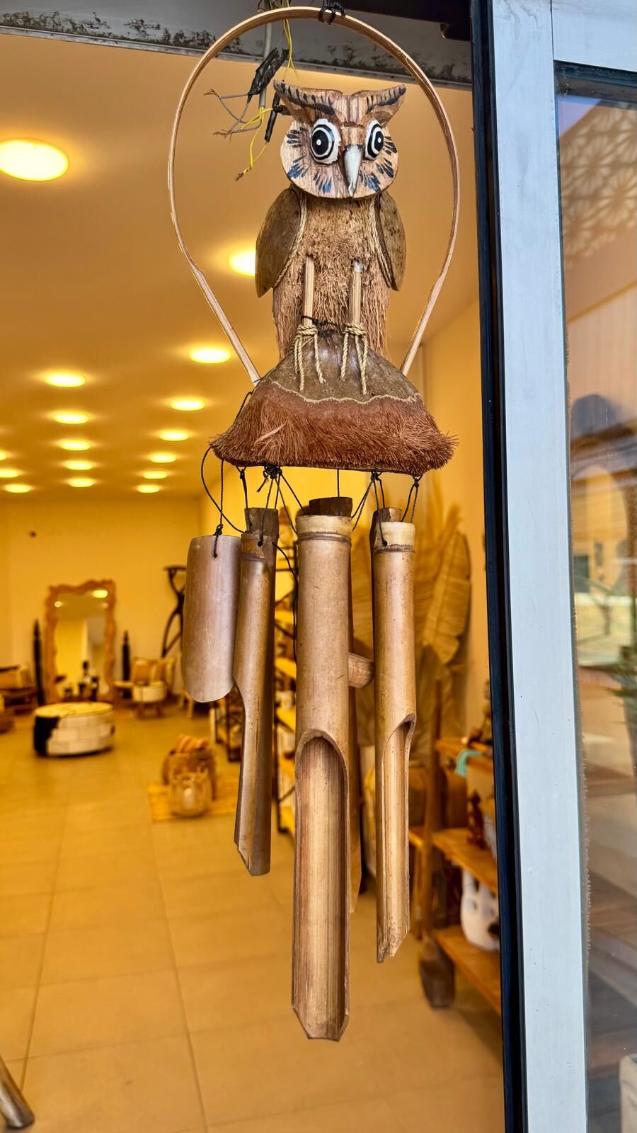 Sevimli baykuş tasarımıyla dikkat çeken bu rüzgar çanı,rüzgarla birlikte çıkan yumuşak bambu tınısı ile doğanın melodisini evinize taşır.