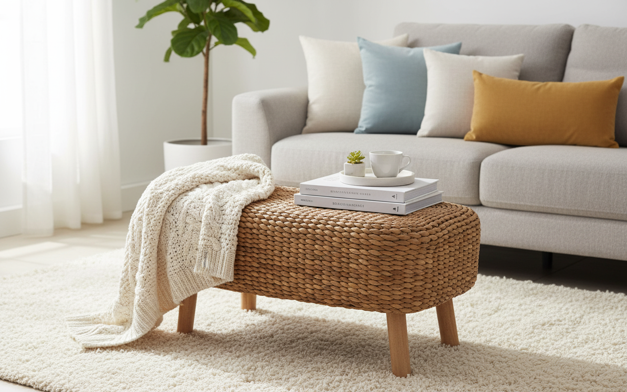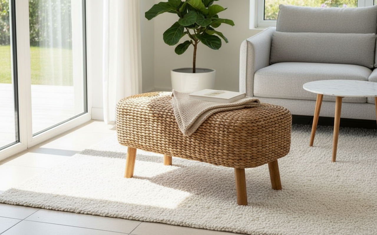 Doğal dokulu ,el işçiliği için hazırlanmış bench ,teak ağacı ahşap ayaklarıyla minimalist bir görünüm sergiler.