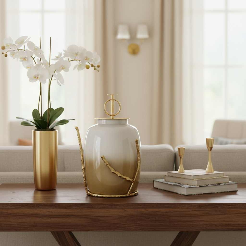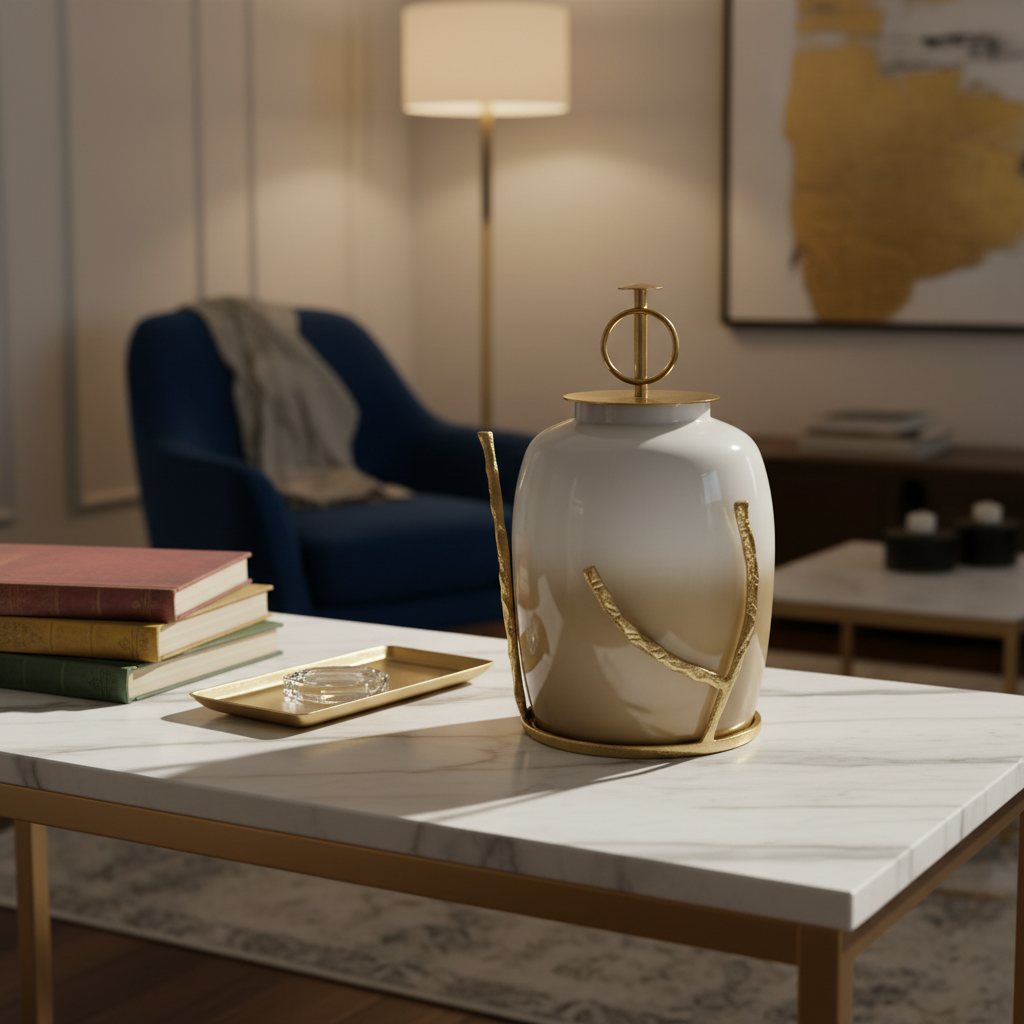 Pürüzsüz yüzeyi,altın renkli metal ayakları ve zarif kapağıyla,her ortamda güçlü bir dekor oluşturur.