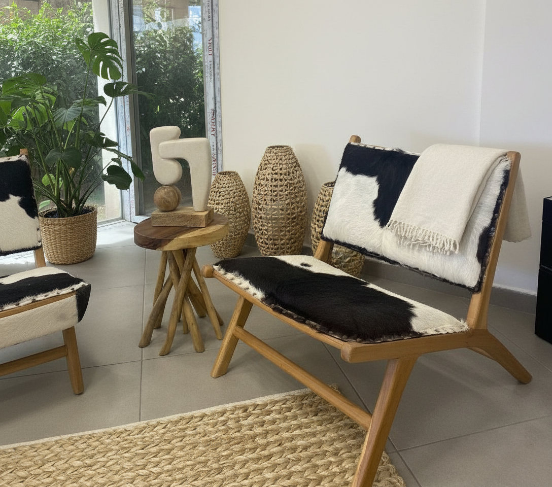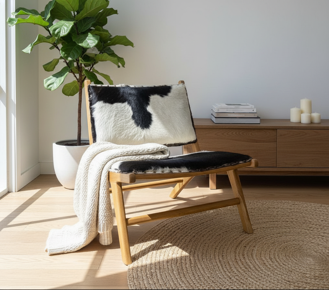Siyah-beyaz desenli derisiyle hem modern hem de boho tarz dekorasyonlara mükemmel uyum sağlar.