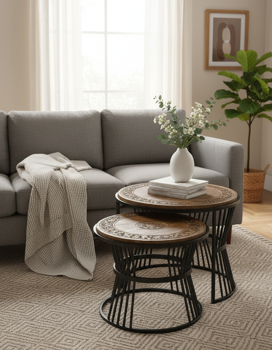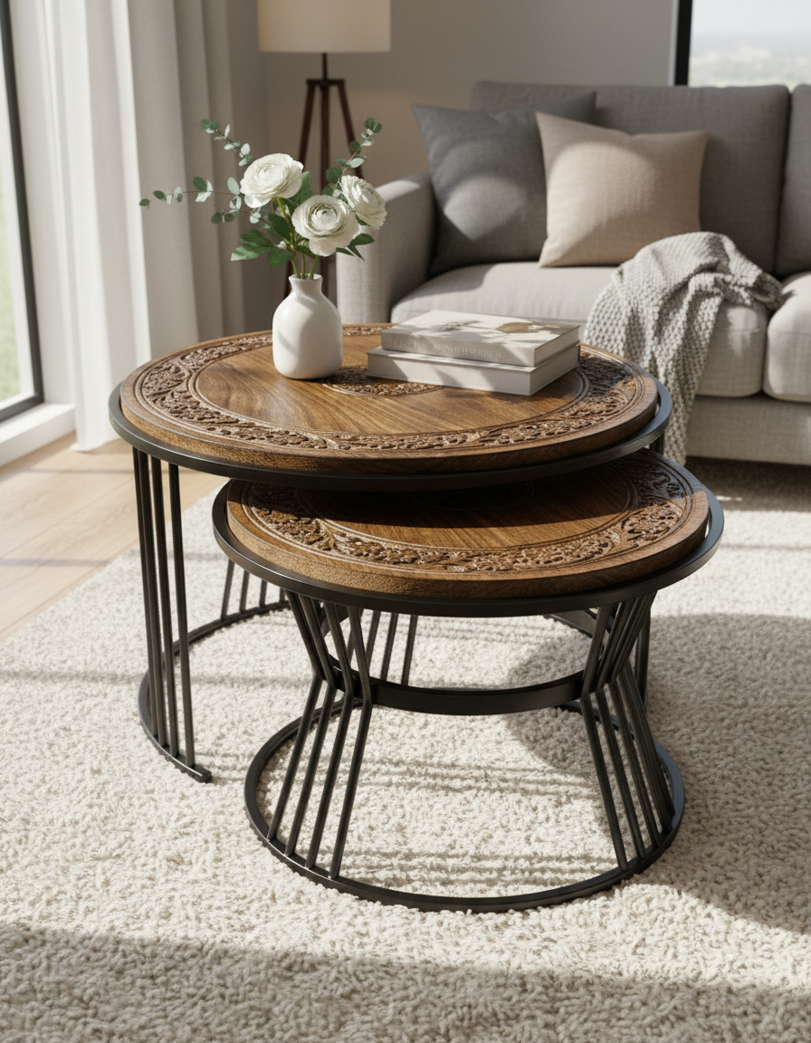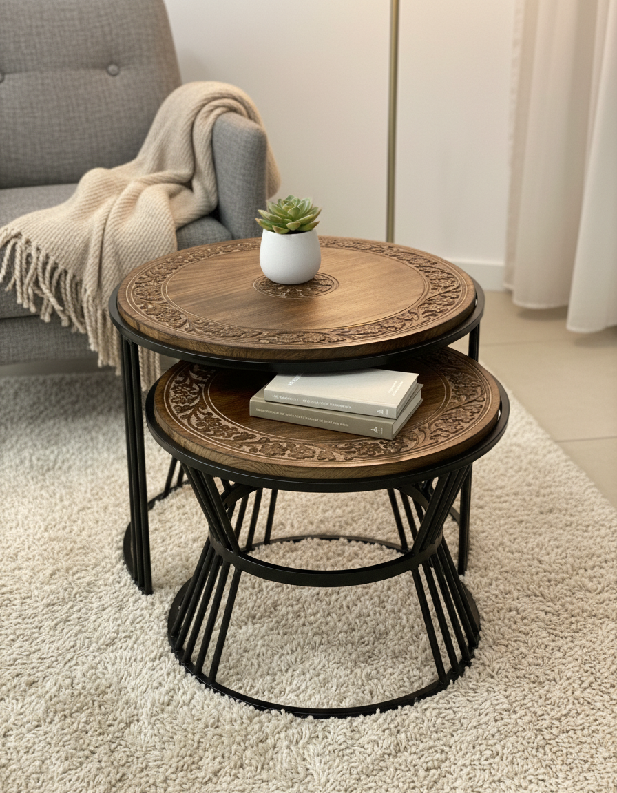 El işçiliği ile özenle oyulmuş ahşap detaylar,metal ayakların güçlü formuyla birleşerek zamansz bir tasarım sunar.İki farklı boy sayesinde hem dekoratif düzenlemelerde hem pratik kullanımda kolaylık sağlar.