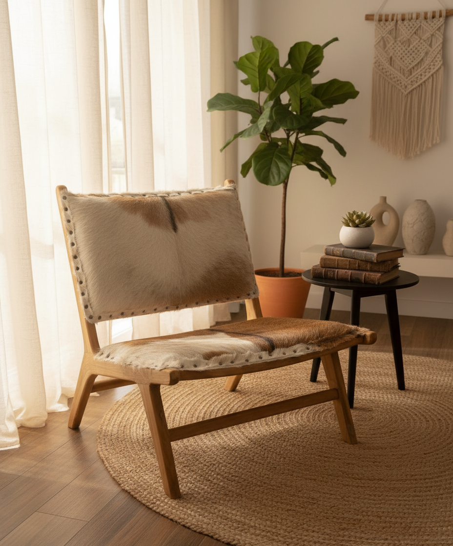 Doğallığın en sıcak hali... El işçiliği ile hazırlanmış keçi derisi döşemesi,her parçada kendine özgü desenleriyle doğanın izlerini taşır. Teak ağacı ahşap iskeleti ile birleşen bu özgün tasarım rustik ve modern mekanlara mükemmel uyum sağlar.