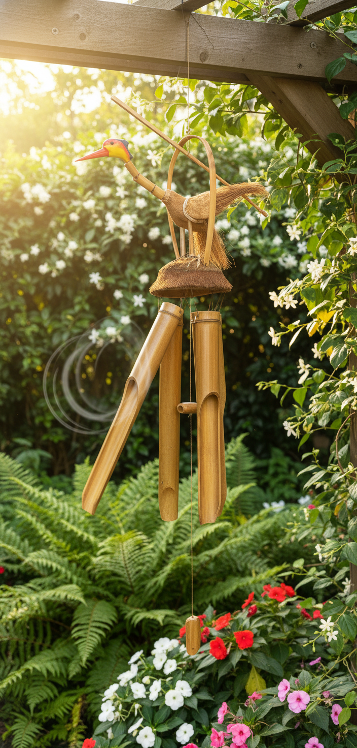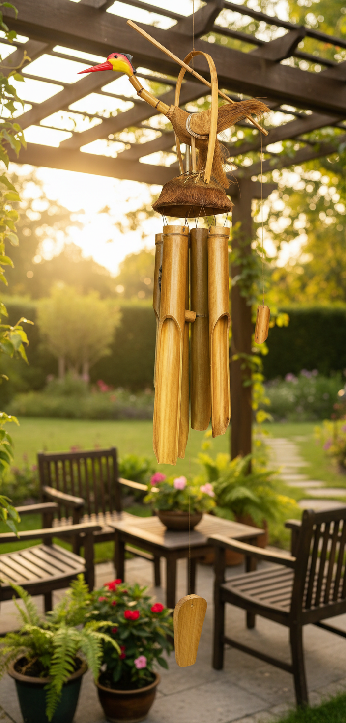 Doğal bambu malzemeden tamamen el işçiliğiyle üretilen bu dekoratif rüzgar çanı ,bahçenize,balkonunuza veya yaşam alanınıza huzurlu bir ambiyans katar.Üst kısmındaki kuş figürü,ürüne hem estetik hem de tropik bir hava kazandırır.