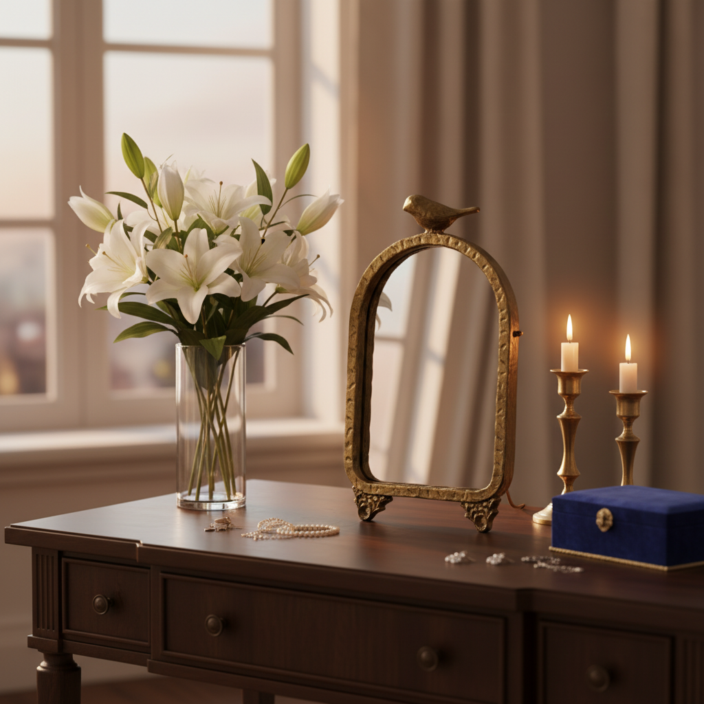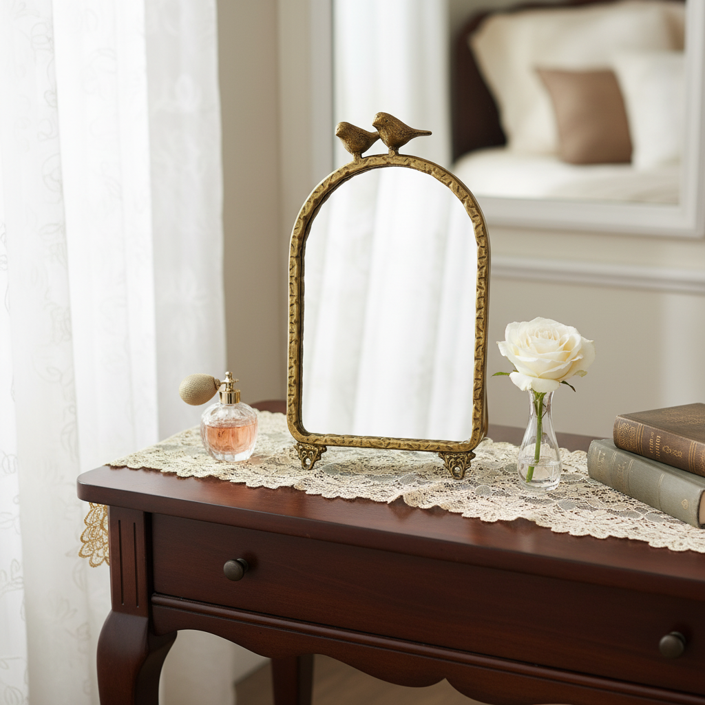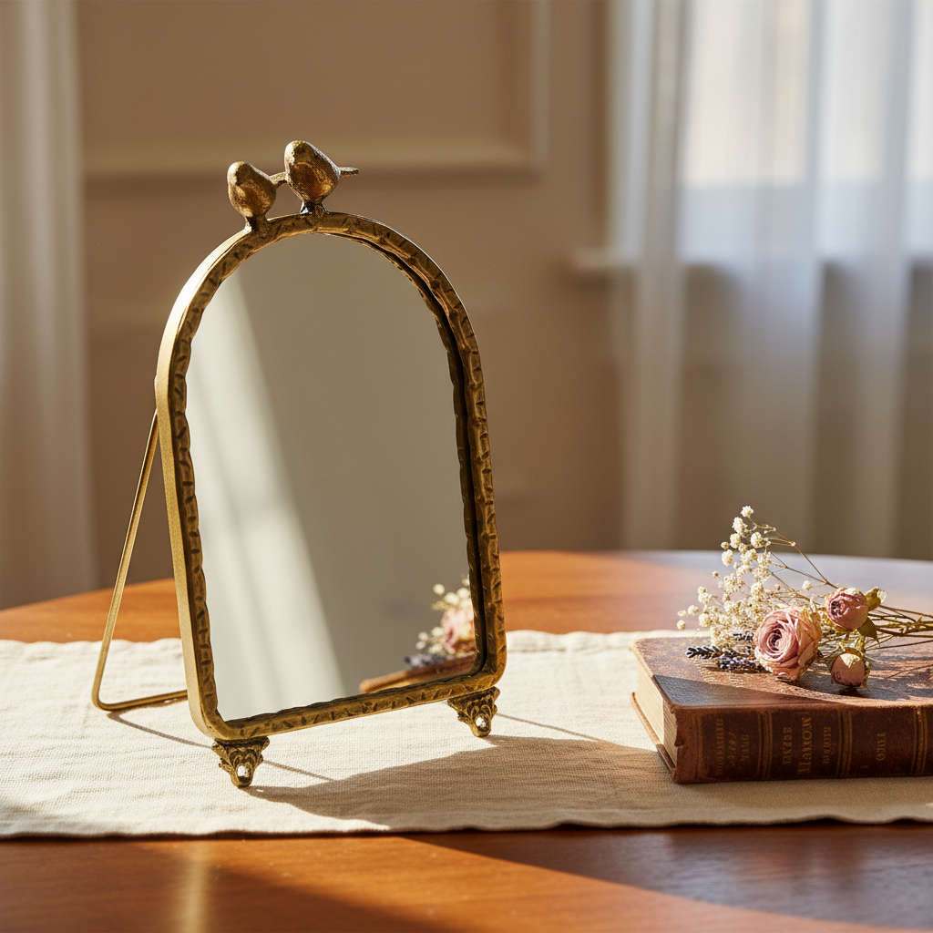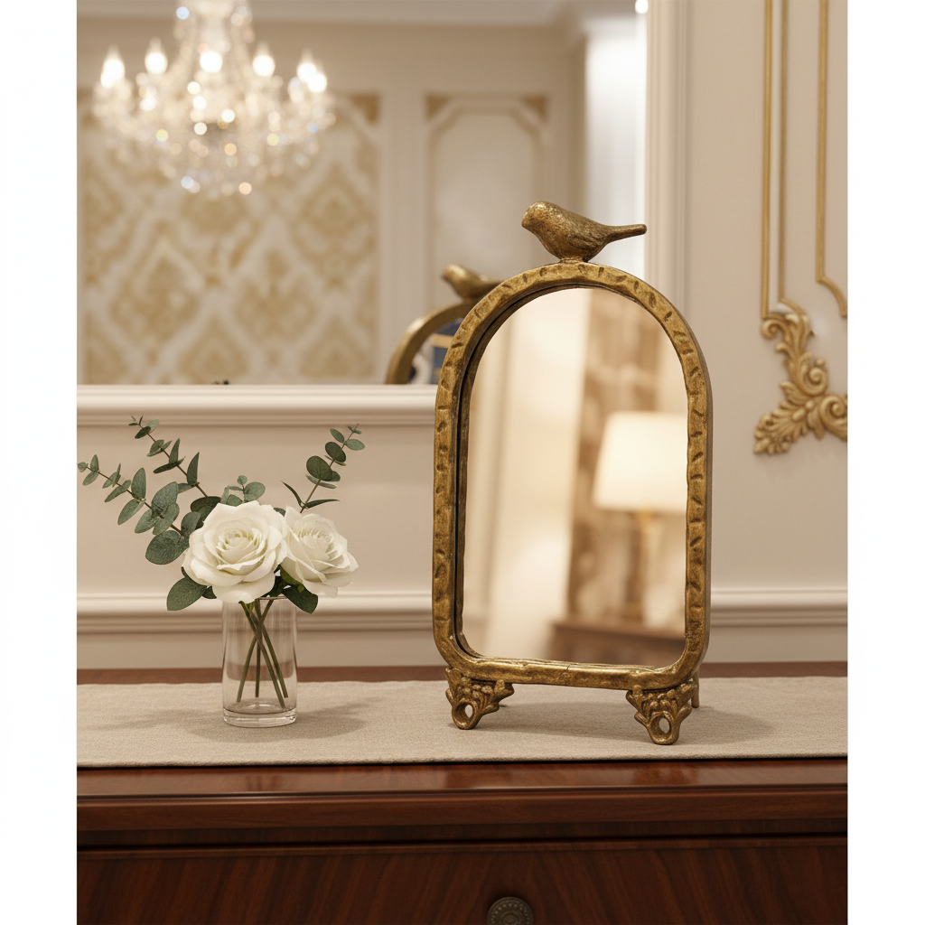 Zarif kuşların eşsiz uyumundan ilham alan bu dekoratif ayna,yaşam alanlarınıza nostaljik bir görünüm katıyor.Antik esintili metal çerçevesi,el işçiliğini andıran detayları,ve sıcak altın tonlarıyla hem şık hem de romantik bir atmosfer yaratır.