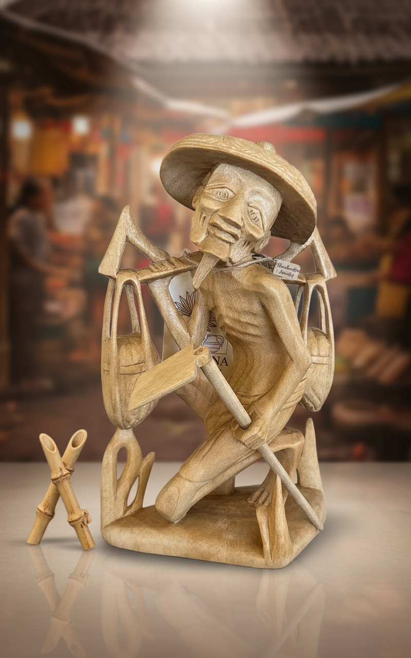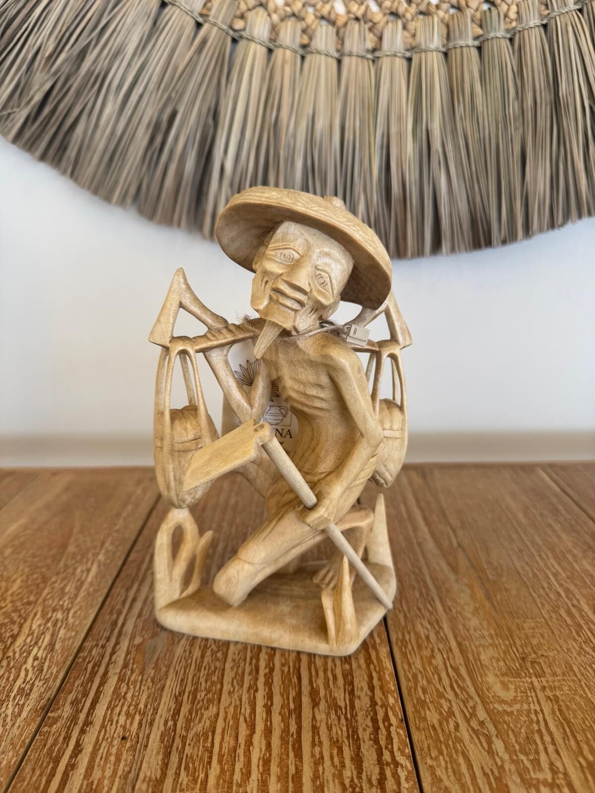 El yapımı,tropik ahşap oyma ürün,ince oyma tekniğiyle işlenmiş;yüz hatları,kas yapısı ve kıyafet kıvrımları dikkatlice şekillendirilmiş.