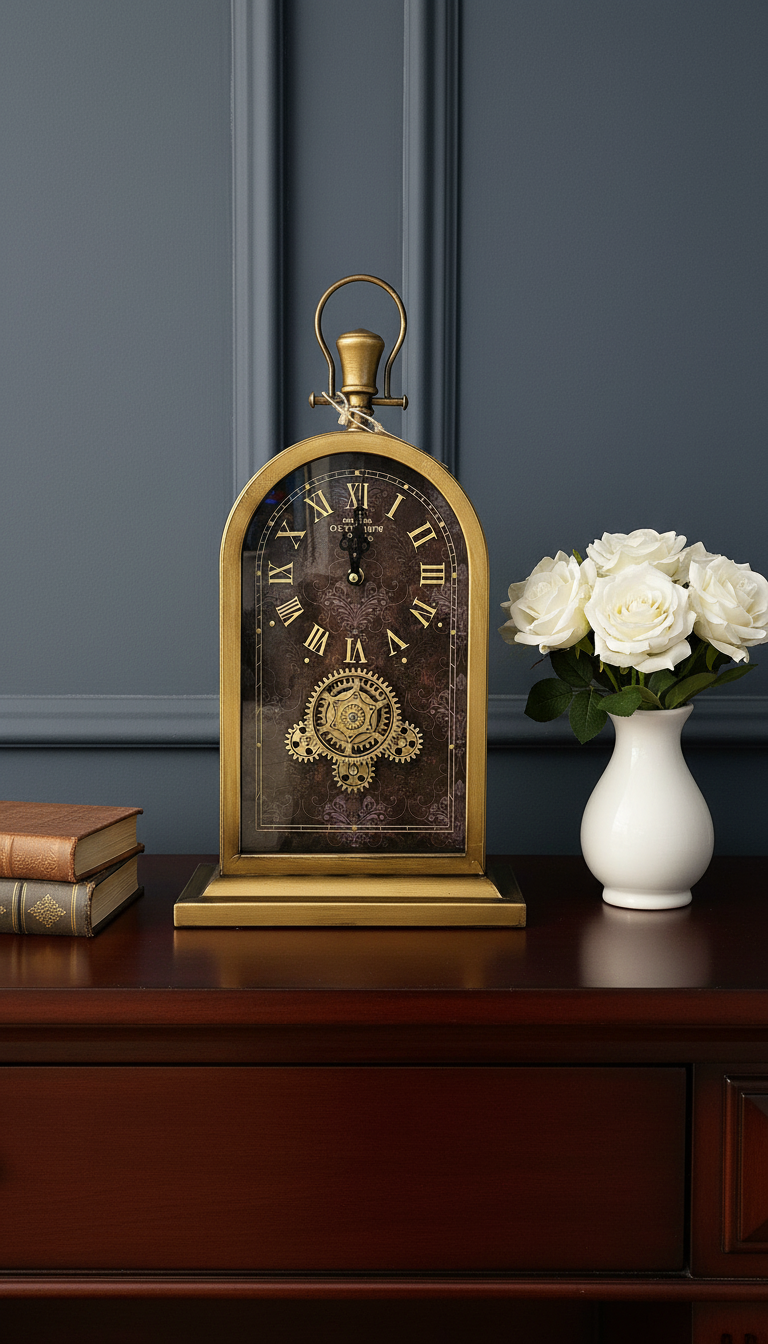 Zarif çerçevesi,arched (kubbeli) formu ve iç kısmındaki detaylı dişli tasarımıyla her ortamda dikkat çeken dekoratif masa saati..Hem işlevsel hem de estetik bir obje arayanlar için ideal.