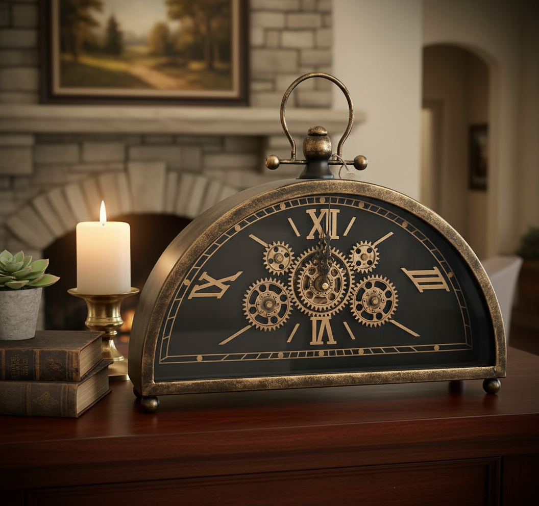 Zamana karakter katan bir dokunuş..Antik esintili metal gövdesi,altın dişli detayları ve yarım daire formuyla bu masa saati,dekorasyonun en dikkat çekici parçası olmaya aday.Hem klasik hem endüstriyel tarzı bir arada yansıtan tasarımıyla,salon,ofis ya da oturma alanlarına nostgaljik bir görünüm katar.