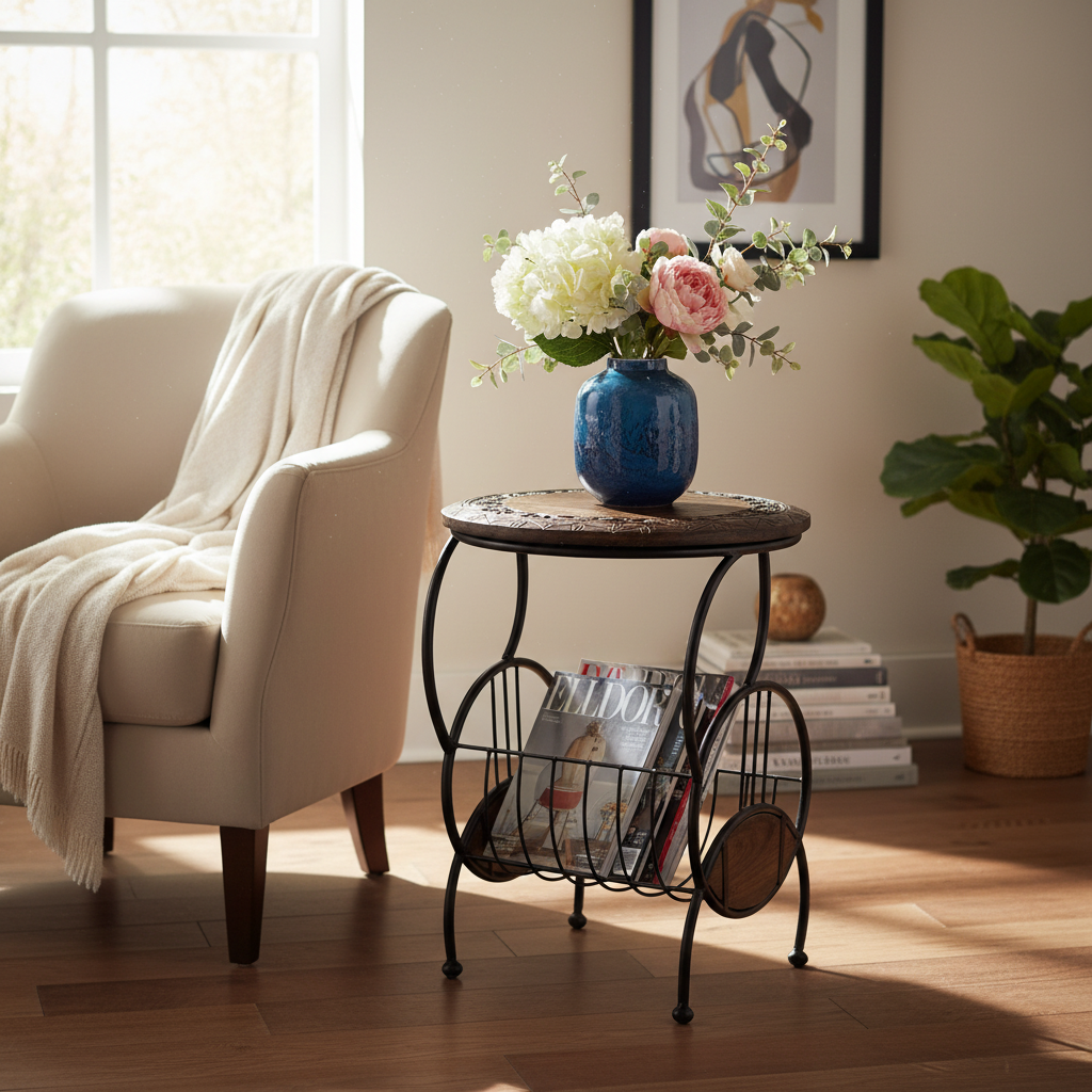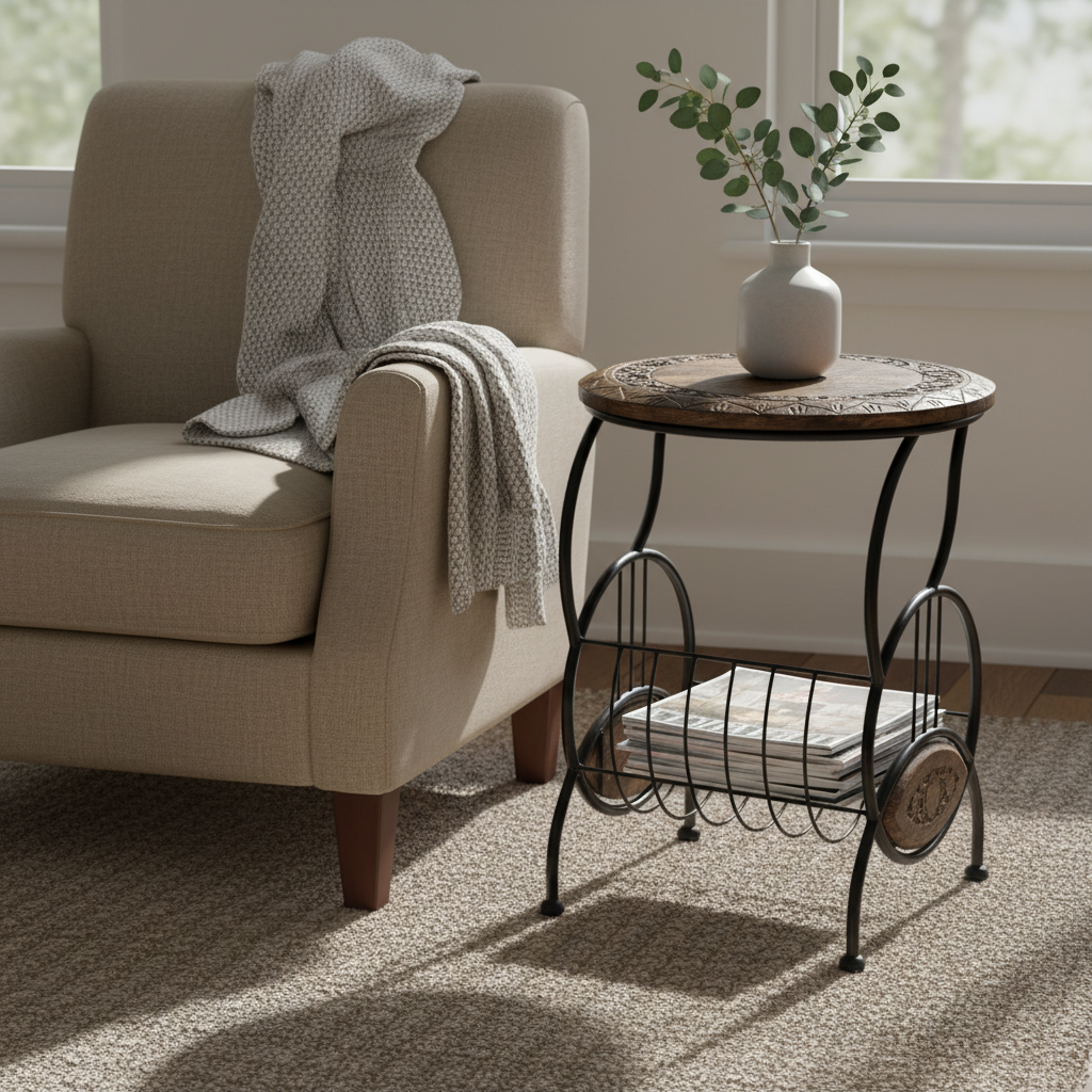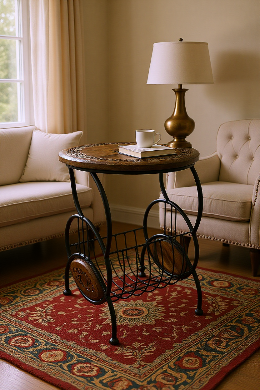 Doğal ahşabın sıcaklığı ile metal zarafetin buluştuğu bu özel tasarım sehpa ,yaşam alanınıza hem estetik hem de işlevselllik katar.El işçiliği oyma detaylara sahip üst tabla,rustik karakteri vurgularken;sağlam metal gövde modern bir denge oluşturur.Alt raf bölümü sayesinde kitap,dergi veya dekor objeleri için kullanışlı bir alan sunar.