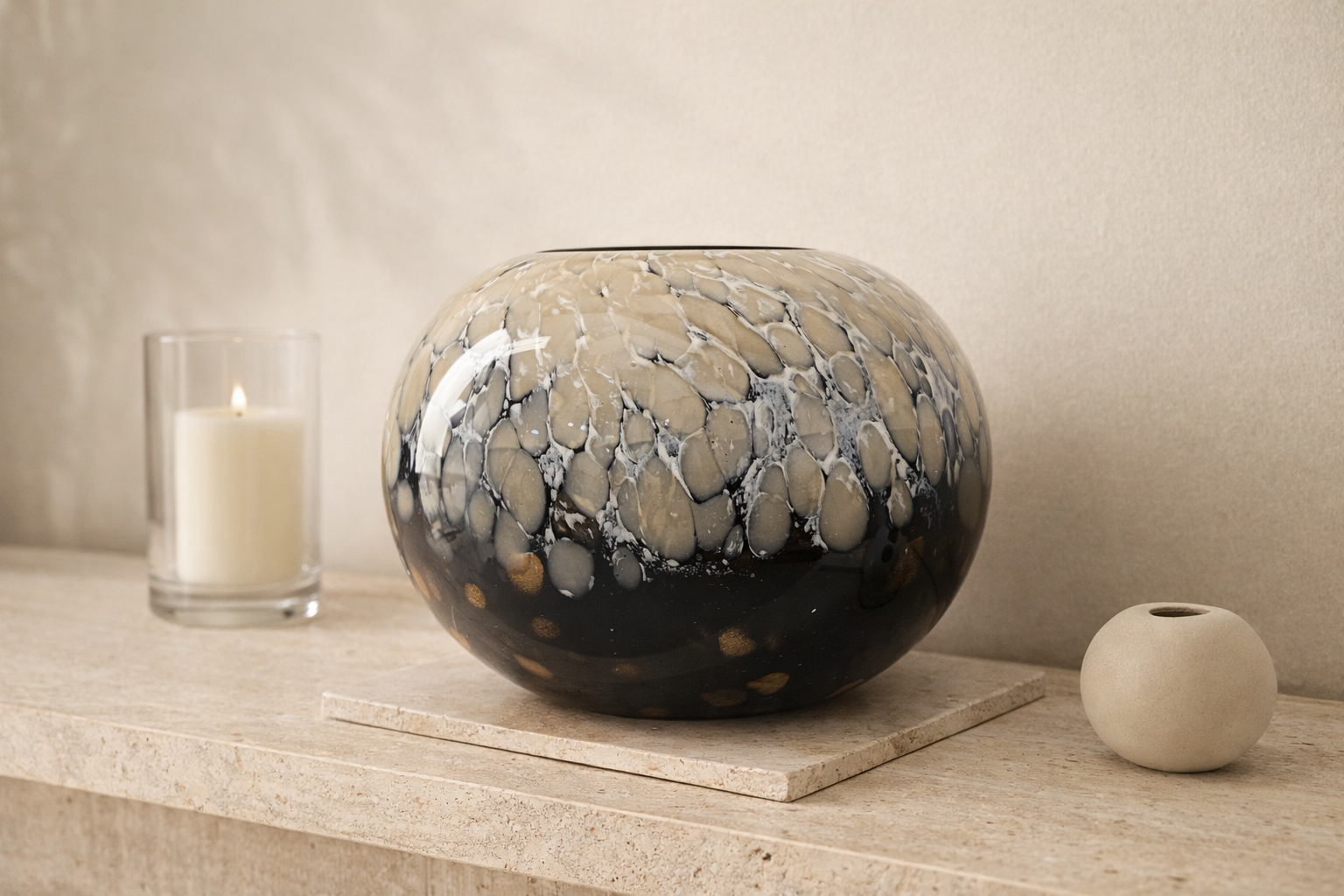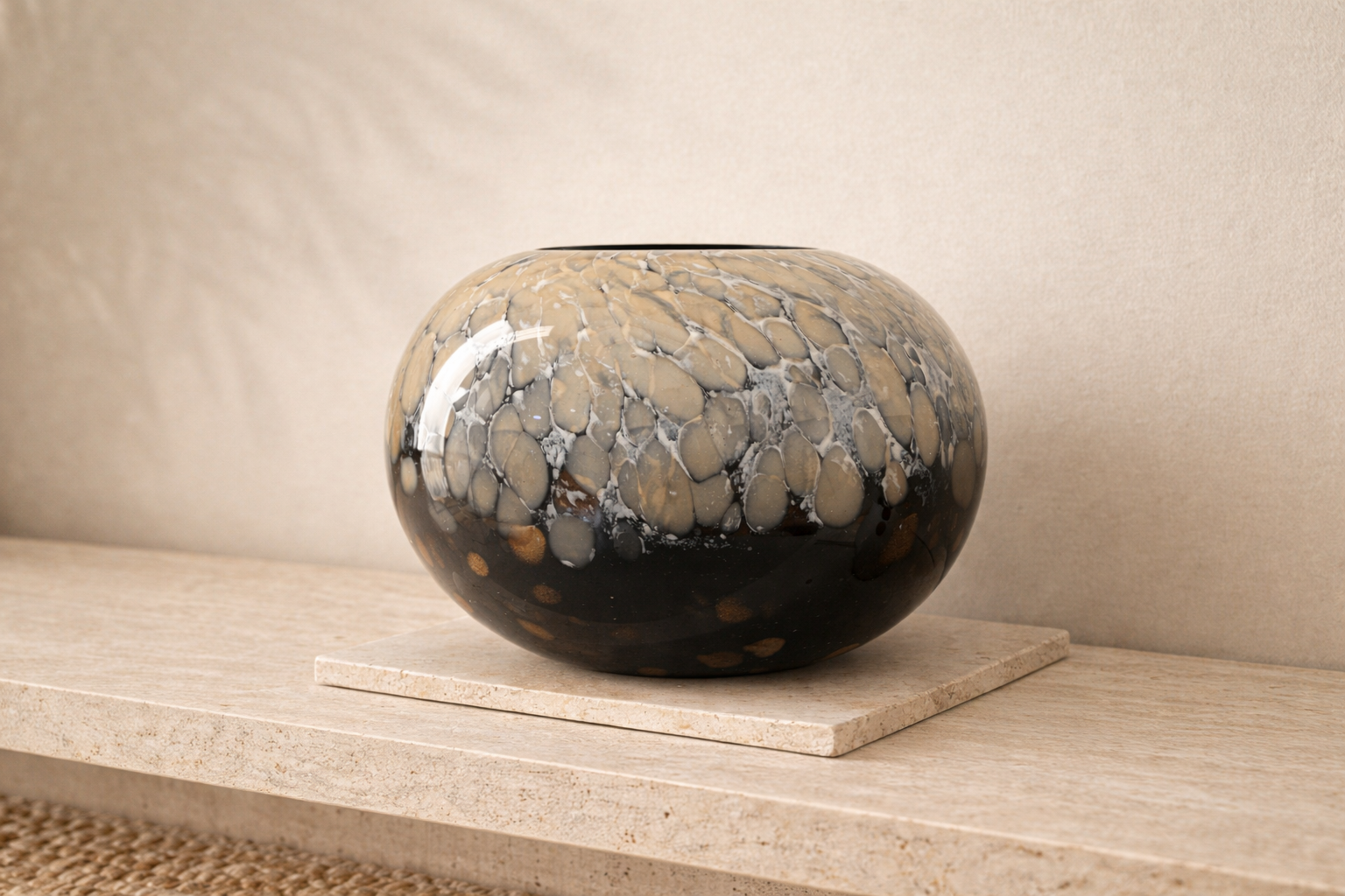Bu siyah cam vazo,akışkan desenleri ve derin renk geçişleriyle sıradanlıktan uzak tasarlandı..