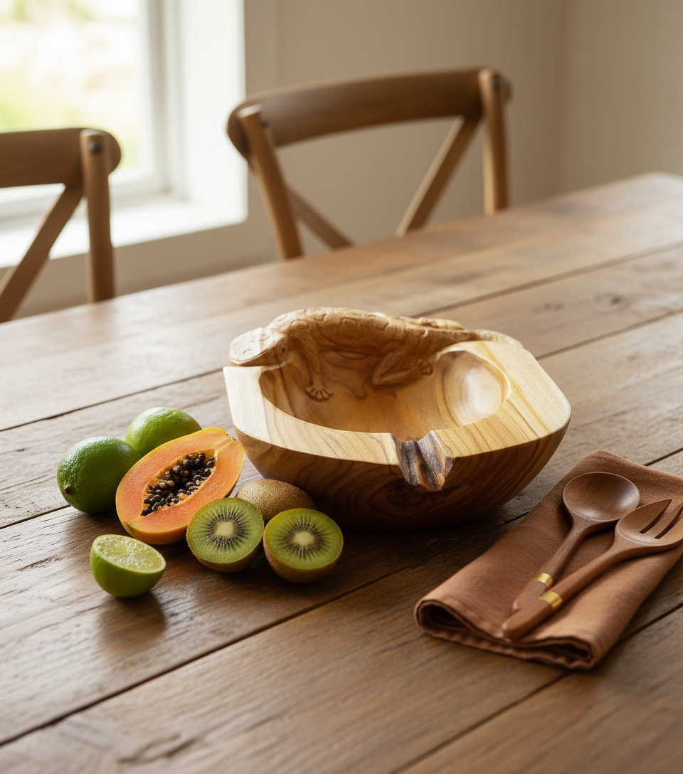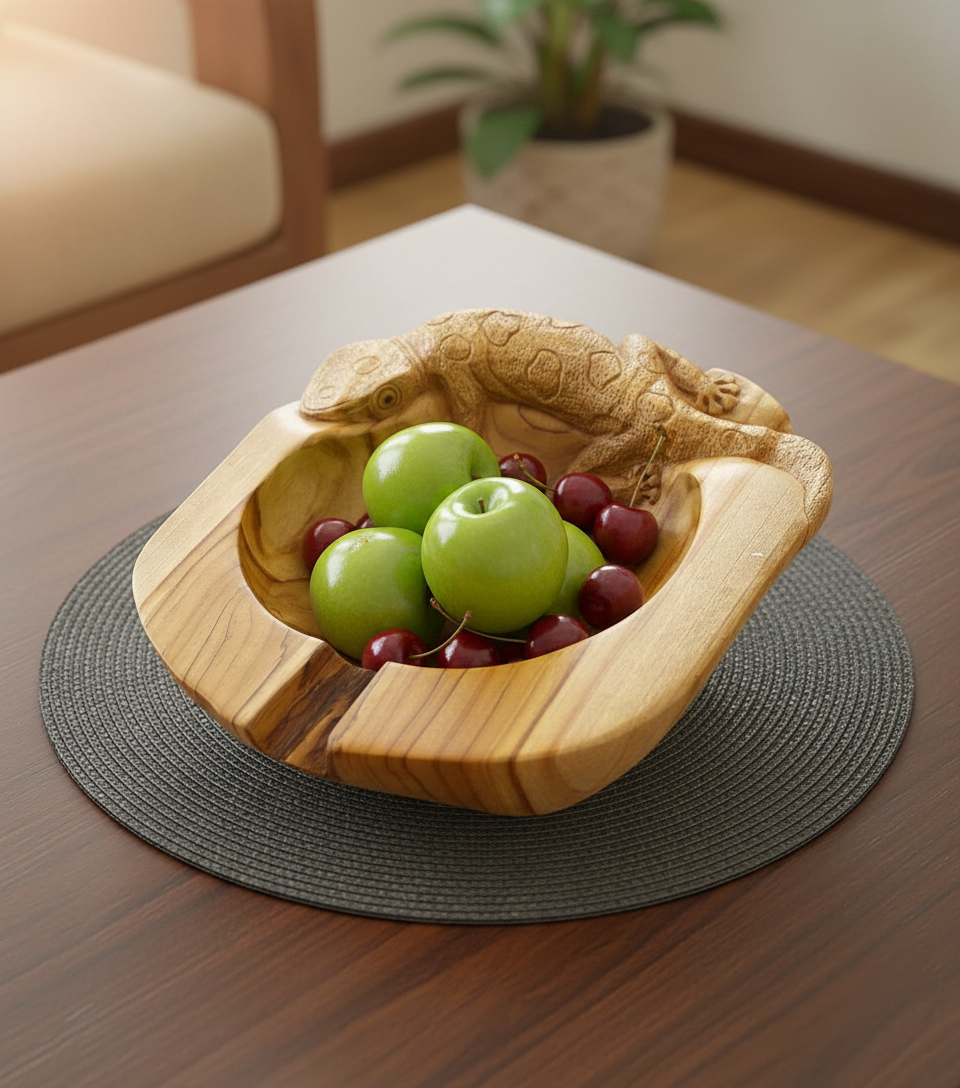 El işçiliğiyle oyulmuş bu ahşap kertenkele detaylı kase,hem dekoratif,hem de işlevsel bir parça.Tek ve özel tasarımıyla sofralarınıza,giriş alanlarınıza ya da sehpalarınıza karakter katar.