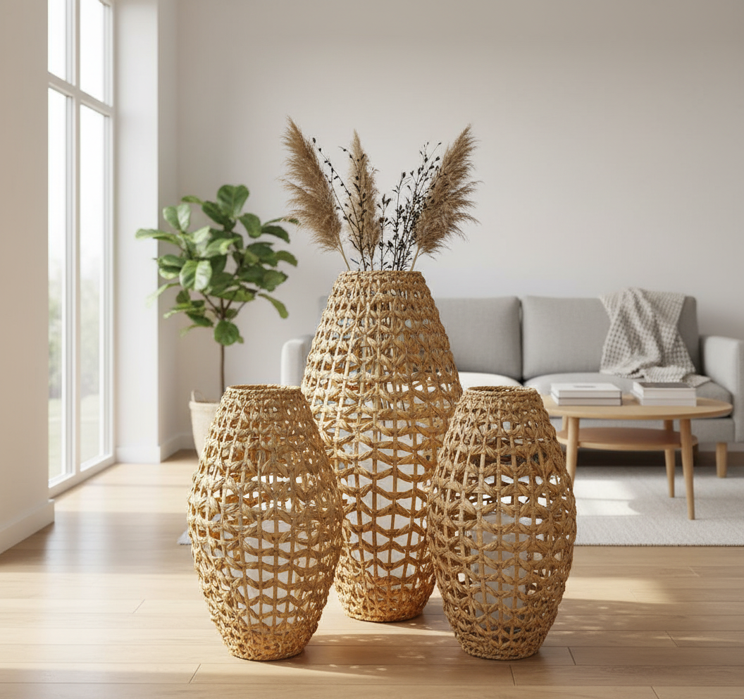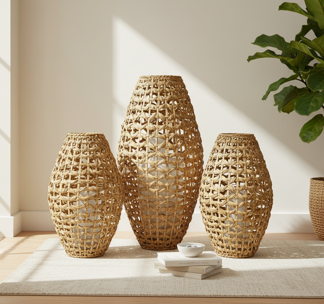 Salon, balkon ya da teras… Işıkla buluştuğunda gölge oyunları yaratan bu hasır fenerler, atmosferi anında yumuşatır.