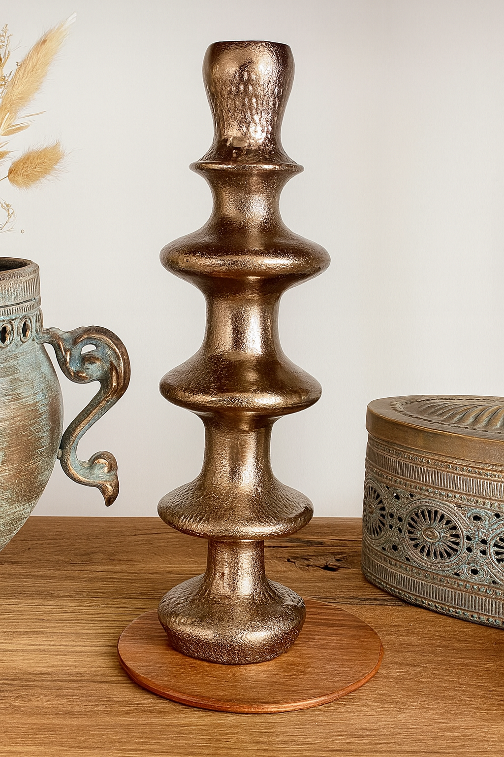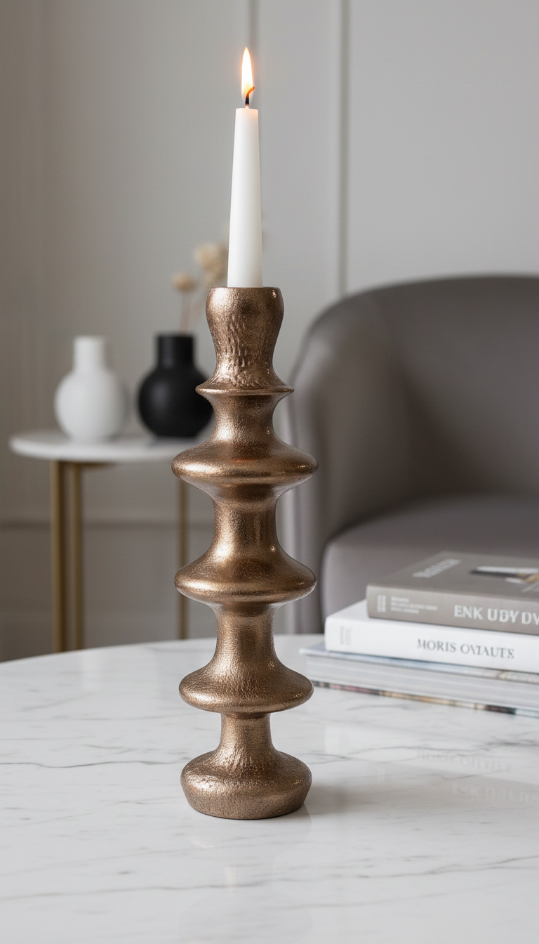 Modern hatları ile bu zarif bronz şamdan,mum ışığını büyülü bir atmosferle buluşturur.
