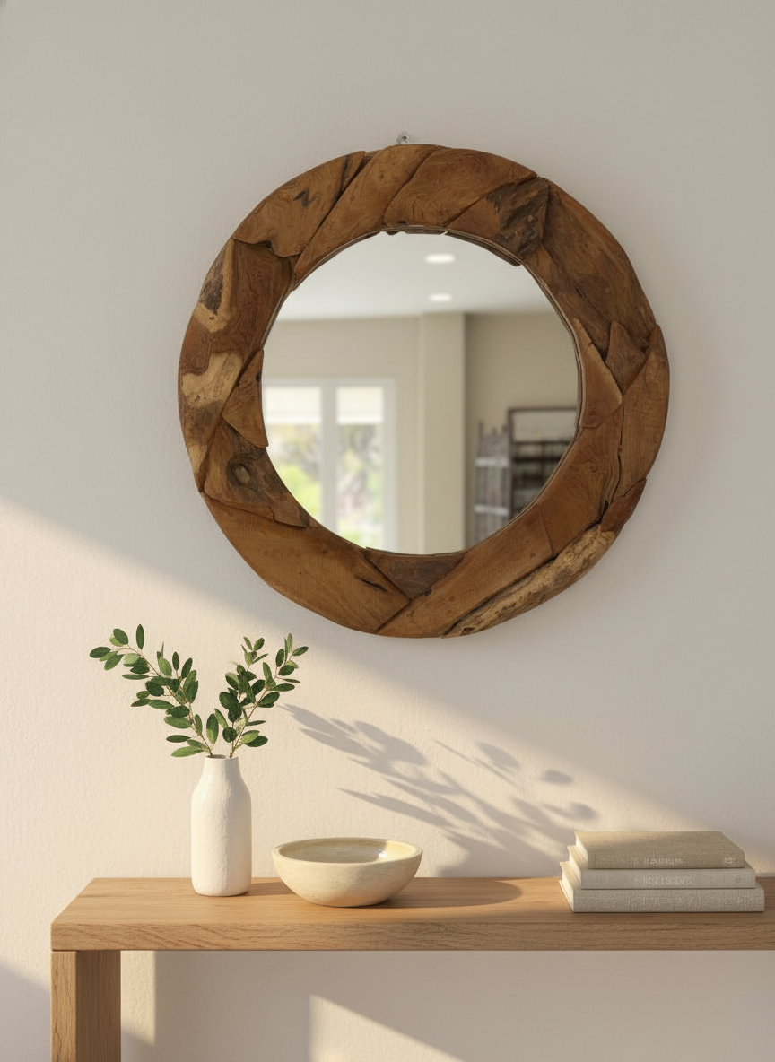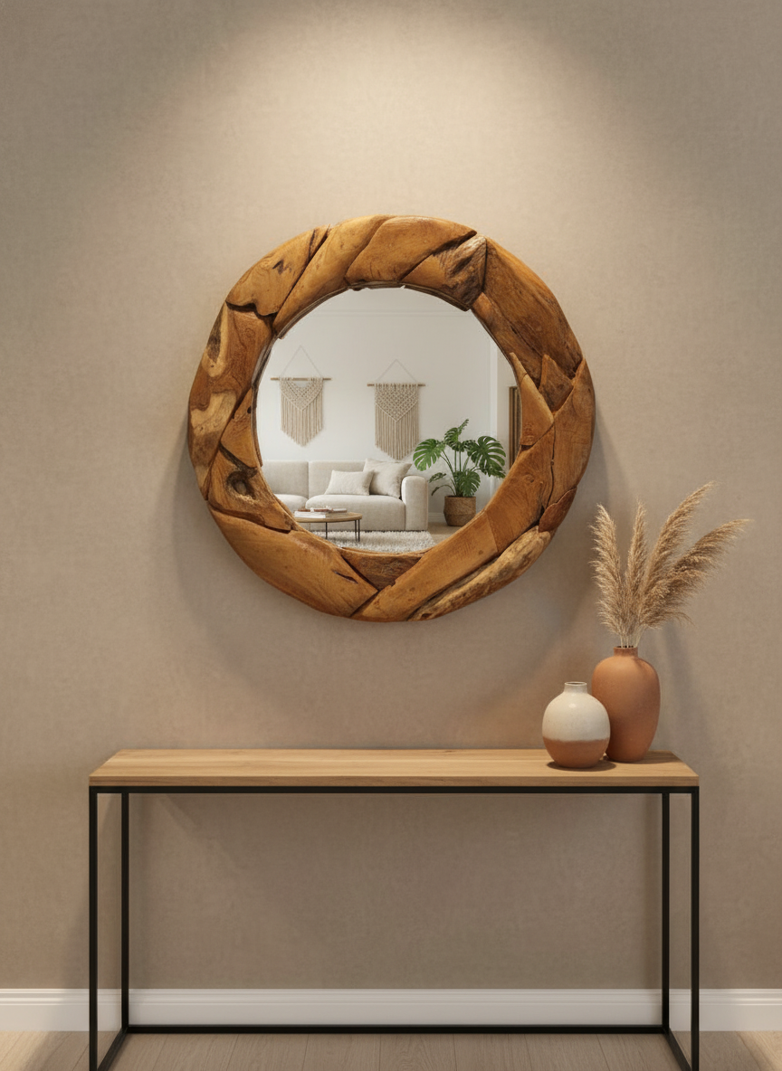 Doğanın en değerli dokularından biri olan teak ağacı,bu aynada kendini güzel bir tasarıma dönüştürüyor.Her bir parçası el işçiliği ile şekillendirilmiş,kendine özgü damar desenleriyle sade ama etkileyici bir görünüm taşıyor.