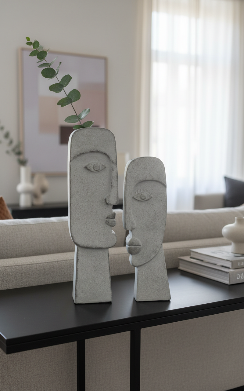 Modern sanatın zarafetini evinize taşıyan bu yüz figürlü beton vazo seti, heykelsi formu ve sade dokusuyla dikkat çeker.