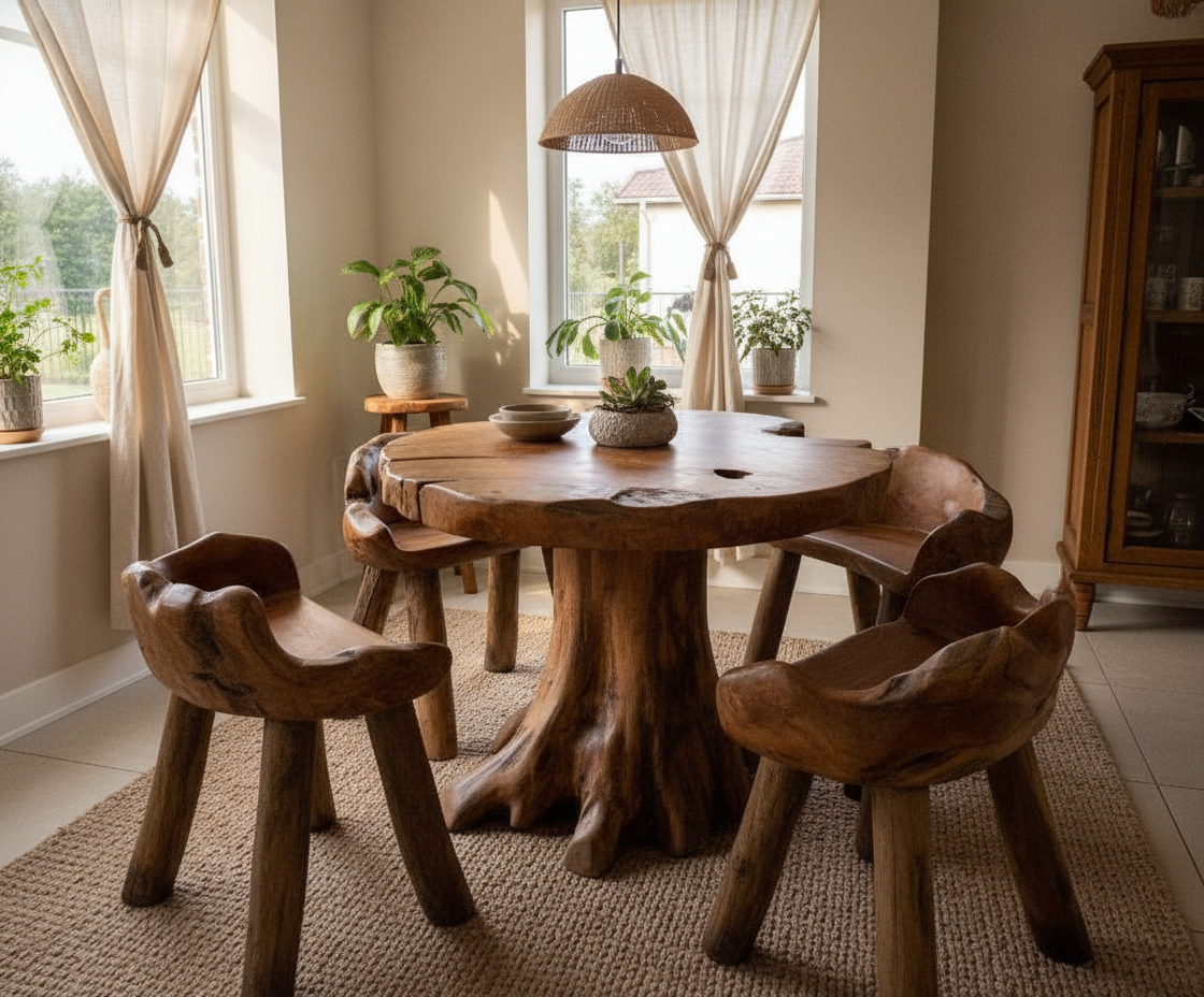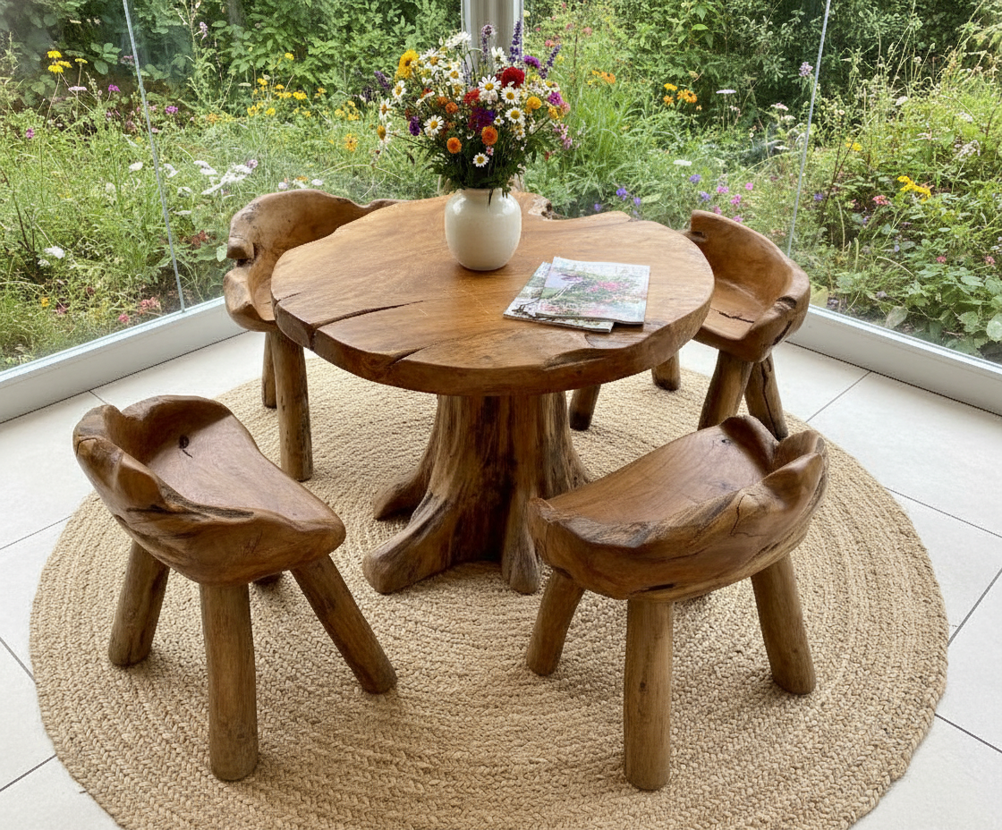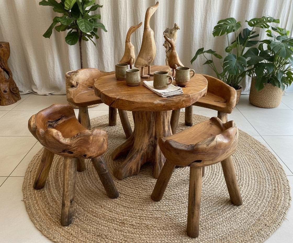 Bu zeytin ağacı masa ve tabure takımı,sadece bir mobilya değil;doğanın sabrını ,emeğini ve sadeliğini taşıyan bir hikaye.Her damarında geçmişin izleri,her yüzeyinde el işçiliğinin sıcak dokunuşu gizli..